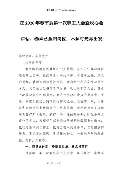 【七哥公文】2026年:在2026年春节后第一次职工大会暨收心会讲话:春风已至归岗位,不负时光再出发+更多免费公文+VX:QiGeGongWen2024