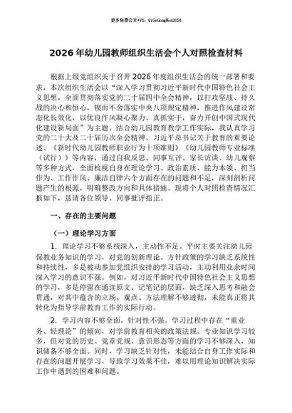 / 【七哥公文】2026年:2026年幼儿园教师组织生活会个人对照检查材料+更多免费公文+VX:QiGeGongWen2024