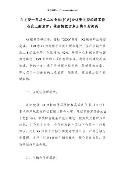 【七哥公文】2026年:在县委十三届十二次全体(扩大)会议暨县委经济工作会议上的发言:做好辣椒文章加快乡村振兴_副本+更多免费公文+VX:QiGeGongWen2024