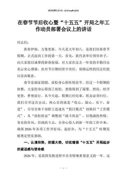 【七哥公文】2026年:在春节节后收心暨“十五五”开局之年工作动员部署会议上的讲话+更多免费公文+VX:QiGeGongWen2024