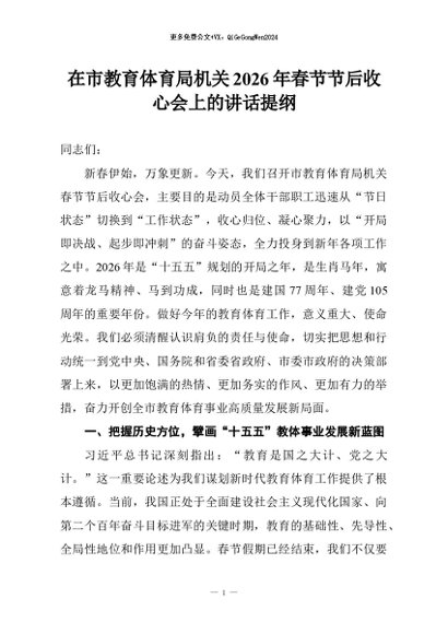 【七哥公文】2026年:在市教育体育局机关2026年春节节后收心会上的讲话提纲+更多免费公文+VX:QiGeGongWen2024
