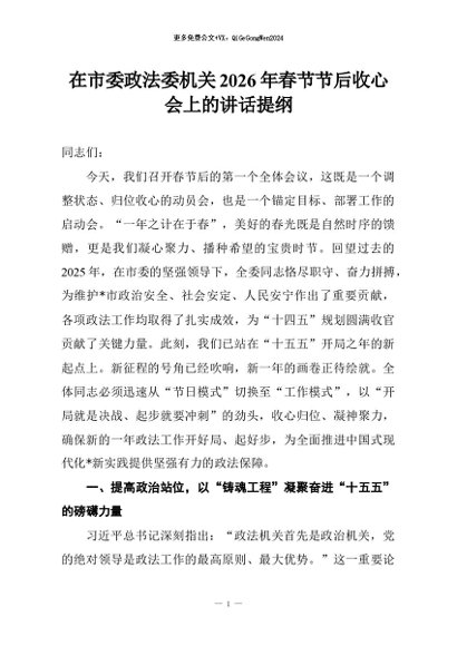 【七哥公文】2026年:在市委政法委机关2026年春节节后收心会上的讲话提纲+更多免费公文+VX:QiGeGongWen2024