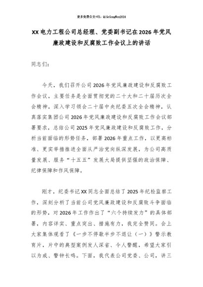 【七哥公文】2026年:XX电力工程公司总经理、党委副书记在2026年党风廉政建设和反腐败工作会议上的讲话2_副本+更多免费公文+VX:QiGeGongWen2024