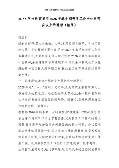 【七哥公文】2026年:在XX学校教育集团2026年春学期开学工作全体教师会议上的讲话(精品)_副本+更多免费公文+VX:QiGeGongWen2024