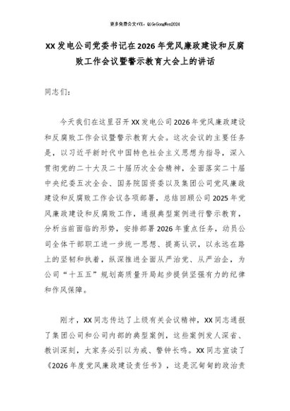 【七哥公文】2026年:XX发电公司党委书记在2026年党风廉政建设和反腐败工作会议暨警示教育大会上的讲话3_副本+更多免费公文+VX:QiGeGongWen2024