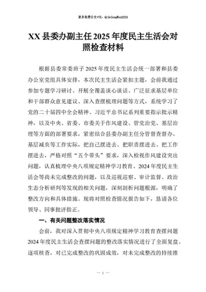 【七哥公文】2026年:XX县委办副主任2025年度民主生活会对照检查材料+更多免费公文+VX:QiGeGongWen2024