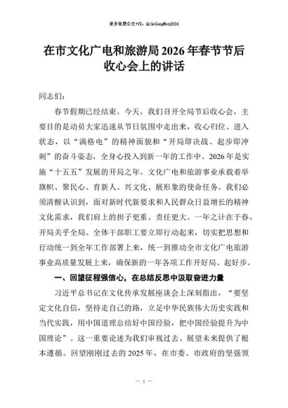 【七哥公文】2026年:在市文化广电和旅游局2026年春节节后收心会上的讲话+更多免费公文+VX:QiGeGongWen2024
