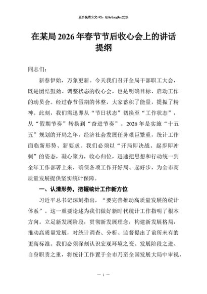 / 【七哥公文】2026年:在某局2026年春节节后收心会上的讲话提纲+更多免费公文+VX:QiGeGongWen2024