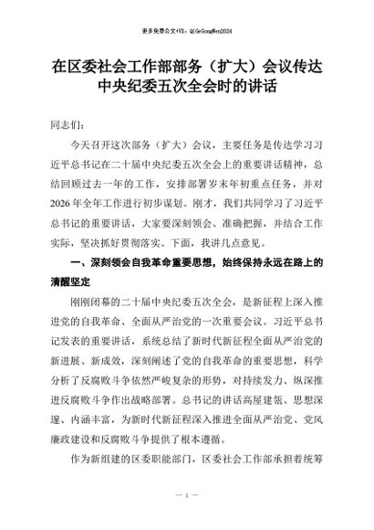 【七哥公文】2026年:在区委社会工作部部务(扩大)会议传达中央纪委五次全会时的讲话+更多免费公文+VX:QiGeGongWen2024