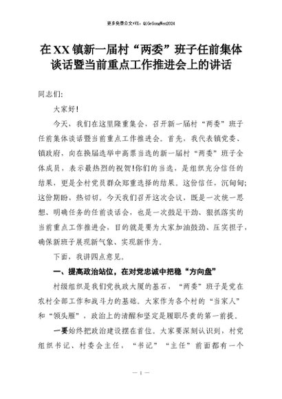 【七哥公文】2026年:在XX镇新一届村“两委”班子任前集体谈话暨当前重点工作推进会上的讲话+更多免费公文+VX:QiGeGongWen2024