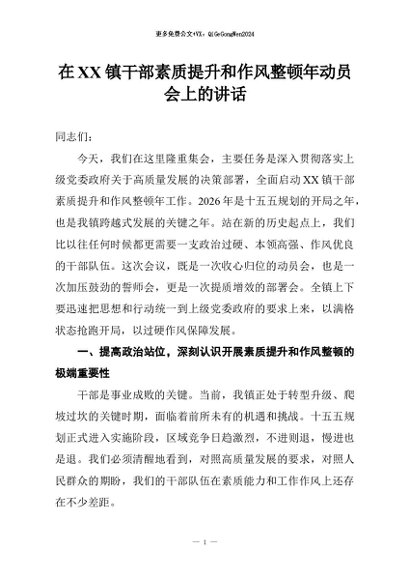 / 【七哥公文】2026年:在XX镇干部素质提升和作风整顿年动员会上的讲话+更多免费公文+VX:QiGeGongWen2024