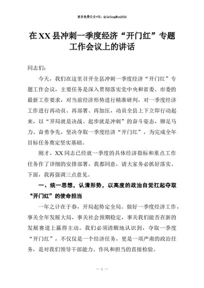 【七哥公文】2026年:在XX县冲刺一季度经济“开门红”专题工作会议上的讲话+更多免费公文+VX:QiGeGongWen2024