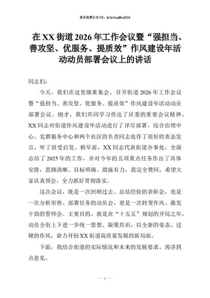 【七哥公文】2026年:在XX街道2026年工作会议暨“强担当、善攻坚、优服务、提质效”作风建设年活动动员部署会议上的讲话+更多免费公文+VX:QiGeGongWen2024