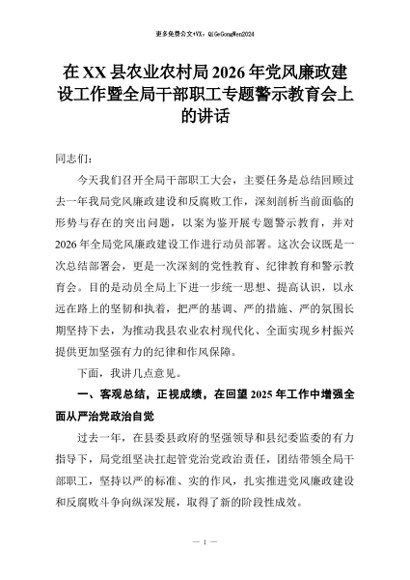 【七哥公文】2026年:在XX县农业农村局2026年党风廉政建设工作暨全局干部职工专题警示教育会上的讲话+更多免费公文+VX:QiGeGongWen2024