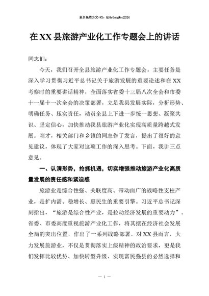 【七哥公文】2026年:在XX县旅游产业化工作专题会上的讲话+更多免费公文+VX:QiGeGongWen2024