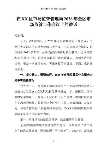 【七哥公文】2026年:在XX区市场监督管理局2026年全区市场监管工作会议上的讲话+更多免费公文+VX:QiGeGongWen2024