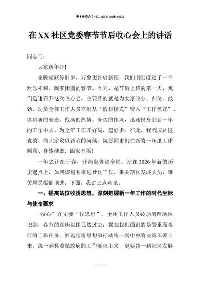 / 【七哥公文】2026年:在XX社区党委春节节后收心会上的讲话+更多免费公文+VX:QiGeGongWen2024