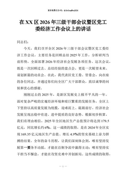 【七哥公文】2026年:在XX区2026年三级干部会议暨区党工委经济工作会议上的讲话+更多免费公文+VX:QiGeGongWen2024