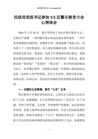 【七哥公文】2026年:民政局党组书记参加XX区警示教育大会心得体会+更多免费公文+VX:QiGeGongWen2024 - 七哥-AI智库