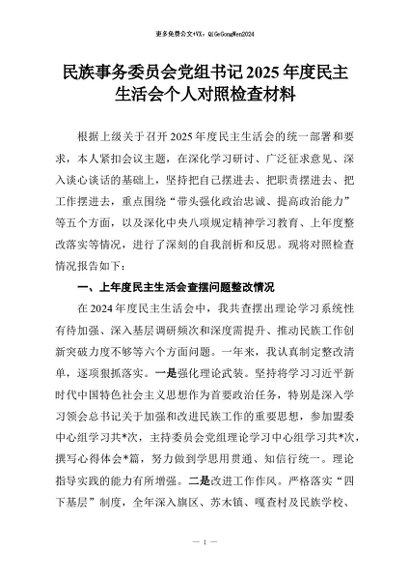 【七哥公文】2026年:民族事务委员会党组书记2025年度民主生活会个人对照检查材料+更多免费公文+VX:QiGeGongWen2024