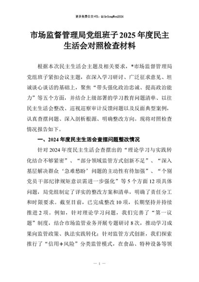 【七哥公文】2026年:市场监督管理局党组班子2025年度民主生活会对照检查材料+更多免费公文+VX:QiGeGongWen2024