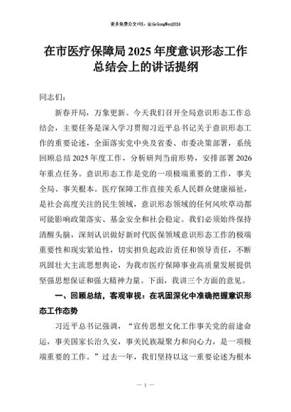 【七哥公文】2026年:在市医疗保障局2025年度意识形态工作总结会上的讲话提纲+更多免费公文+VX:QiGeGongWen2024