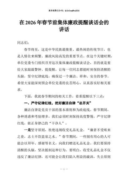 / 【七哥公文】2026年:在2026年春节前集体廉政提醒谈话会的讲话+更多免费公文+VX:QiGeGongWen2024