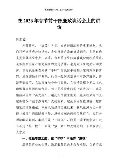 / 【七哥公文】2026年:在2026年春节前干部廉政谈话会上的讲话+更多免费公文+VX:QiGeGongWen2024
