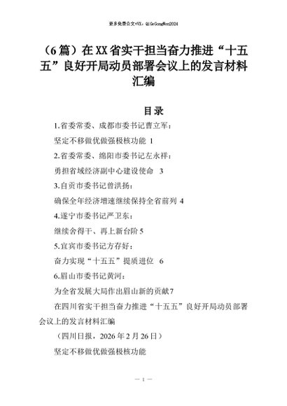 【七哥公文】2026年:(6篇)在XX省实干担当奋力推进“十五五”良好开局动员部署会议上的发言材料汇编+更多免费公文+VX:QiGeGongWen2024