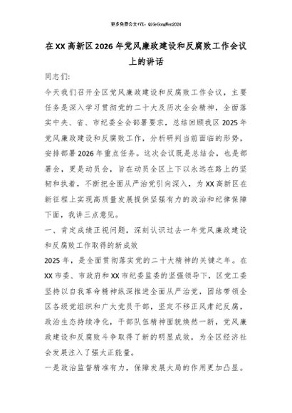 【七哥公文】2026年:在XX高新区2026年党风廉政建设和反腐败工作会议上的讲话_副本+更多免费公文+VX:QiGeGongWen2024