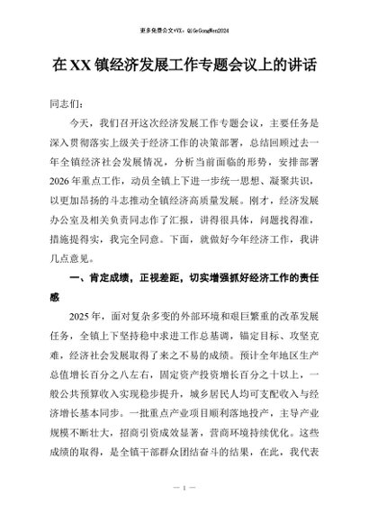 / 【七哥公文】2026年:在XX镇经济发展工作专题会议上的讲话+更多免费公文+VX:QiGeGongWen2024