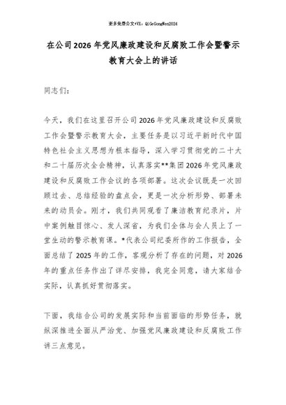 【七哥公文】2026年:在公司2026年党风廉政建设和反腐败工作会暨警示教育大会上的讲话_副本+更多免费公文+VX:QiGeGongWen2024
