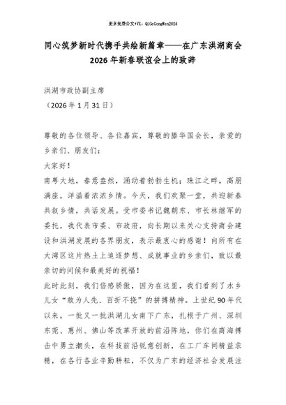 【七哥公文】2026年:同心筑梦新时代携手共绘新篇章——在广东洪湖商会2026年新春联谊会上的致辞_副本+更多免费公文+VX:QiGeGongWen2024