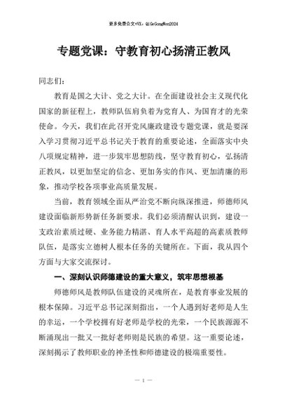 【七哥公文】2026年:专题党课:守教育初心扬清正教风+更多免费公文+VX:QiGeGongWen2024