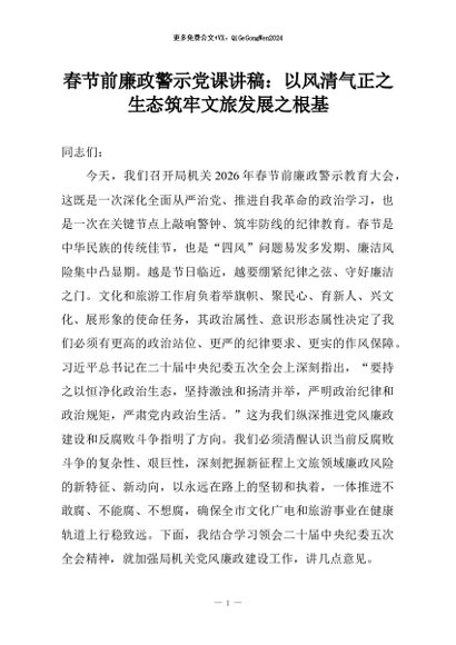 【七哥公文】2026年:春节前廉政警示党课讲稿:以风清气正之生态筑牢文旅发展之根基+更多免费公文+VX:QiGeGongWen2024