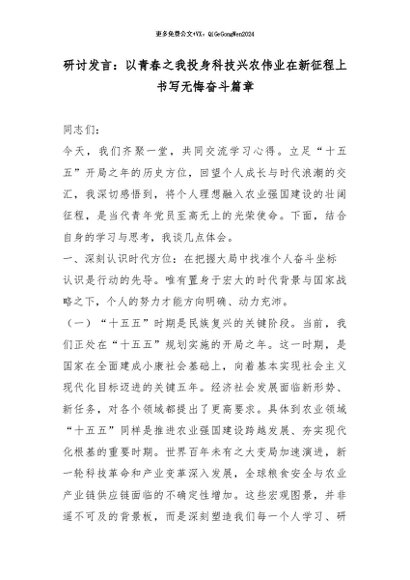 【七哥公文】2026年:研讨发言:以青春之我投身科技兴农伟业在新征程上书写无悔奋斗篇章_副本+更多免费公文+VX:QiGeGongWen2024