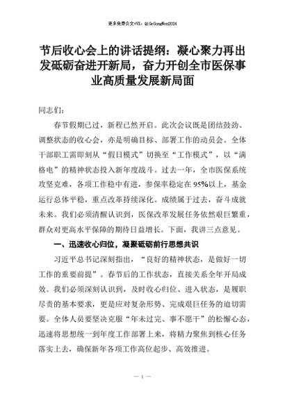 【七哥公文】2026年:节后收心会上的讲话提纲:凝心聚力再出发砥砺奋进开新局,奋力开创全市医保事业高质量发展新局面+更多免费公文+VX:QiGeGongWen2024