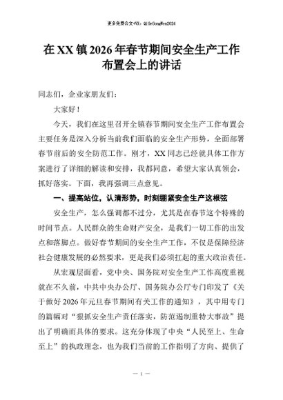 【七哥公文】2026年:在XX镇2026年春节期间安全生产工作布置会上的讲话+更多免费公文+VX:QiGeGongWen2024