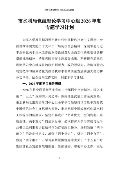 【七哥公文】2026年:市水利局党组理论学习中心组2026年度专题学习计划+更多免费公文+VX:QiGeGongWen2024
