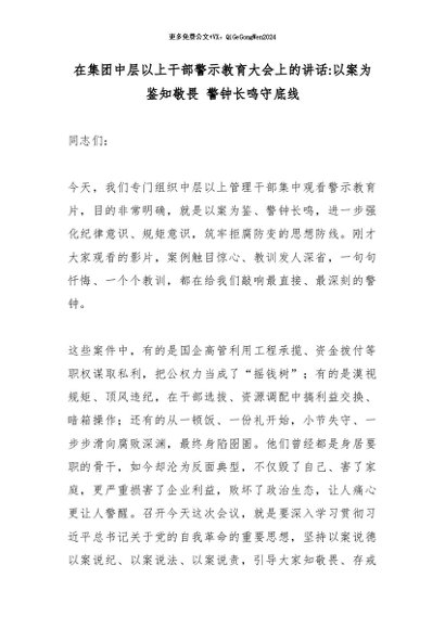 【七哥公文】2026年:在集团中层以上干部警示教育大会上的讲话:以案为鉴知敬畏 警钟长鸣守底线_副本+更多免费公文+VX:QiGeGongWen2024