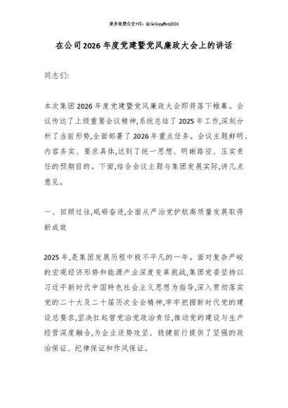 【七哥公文】2026年:在公司2026年度党建暨党风廉政大会上的讲话_副本+更多免费公文+VX:QiGeGongWen2024
