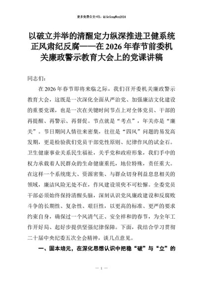 【七哥公文】2026年:以破立并举的清醒定力纵深推进卫健系统正风肃纪反腐——在2026年春节前委机关廉政警示教育大会上的党课讲稿+更多免费公文+VX:QiGeGongWen2024