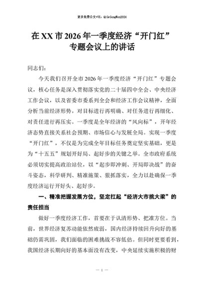 【七哥公文】2026年:在XX市2026年一季度经济“开门红”专题会议上的讲话+更多免费公文+VX:QiGeGongWen2024