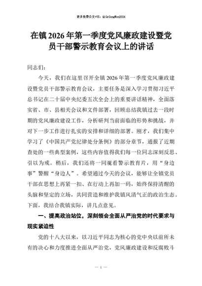 【七哥公文】2026年:在镇2026年第一季度党风廉政建设暨党员干部警示教育会议上的讲话+更多免费公文+VX:QiGeGongWen2024