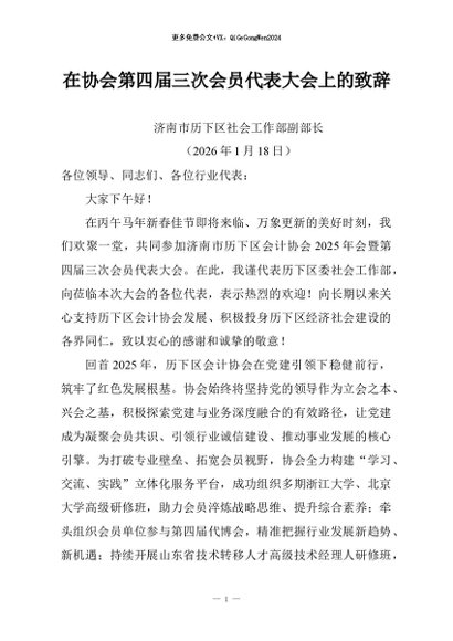 【七哥公文】2026年:在协会第四届三次会员代表大会上的致辞+更多免费公文+VX:QiGeGongWen2024
