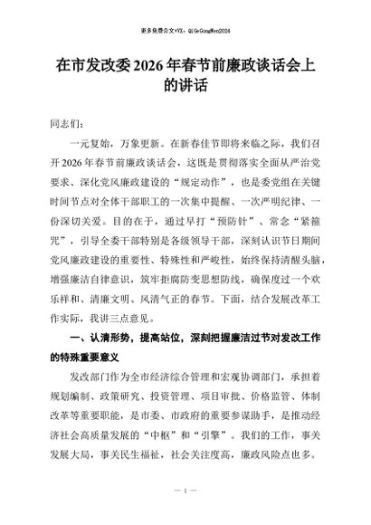 / 【七哥公文】2026年:在市发改委2026年春节前廉政谈话会上的讲话+更多免费公文+VX:QiGeGongWen2024