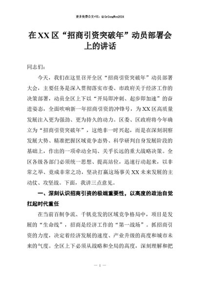 / 【七哥公文】2026年:在XX区“招商引资突破年”动员部署会上的讲话+更多免费公文+VX:QiGeGongWen2024