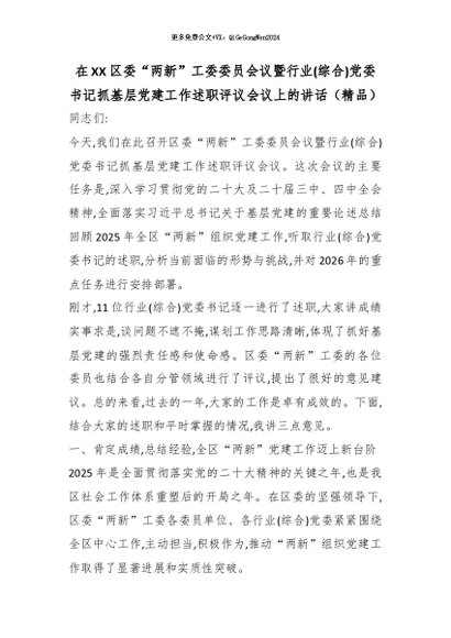 【七哥公文】2026年:在XX区委“两新”工委委员会议暨行业(综合)党委书记抓基层党建工作述职评议会议上的讲话(精品)_副本+更多免费公文+VX:QiGeGongWen2024