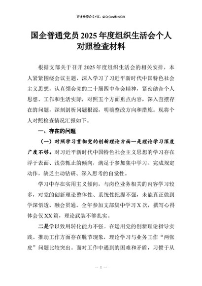 【七哥公文】2026年:国企普通党员2025年度组织生活会个人对照检査材料+更多免费公文+VX:QiGeGongWen2024