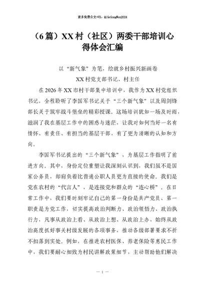 【七哥公文】2026年:(6篇)XX村(社区)两委干部培训心得体会汇编+更多免费公文+VX:QiGeGongWen2024